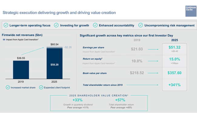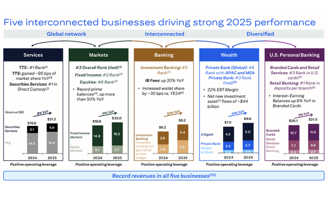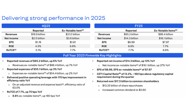 Scharf highlighted that year-on-year earnings per share grew 17%, fee income grew 5% and net loan losses fell 16%. At the same time, the bank returned $23 billion to shareholders in 2025, including $18 billion in buybacks, and increased the dividend by 13%. Management said it was able to fund significant infrastructure investment and growth by reducing its cost base over the long term, which has fallen by $15 billion cumulatively over the past five years.