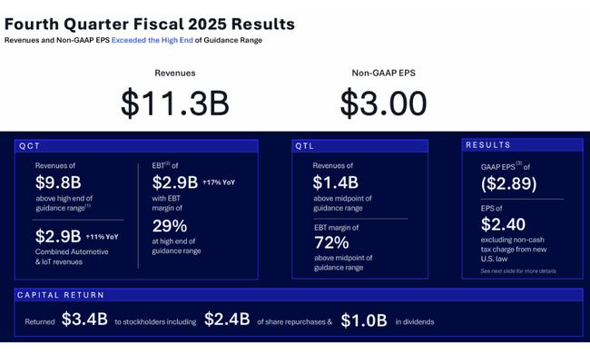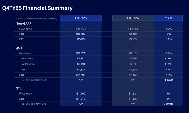 At the earnings level, you can see how quickly AMD's results stabilized after the "export control" intervention in the second quarter. GAAP operating profit jumped to $1.27 billion, non-GAAP operating profit to $2.24 billion. GAAP net income of $1.24 billion and non-GAAP net income of $1.97 billion represent tens of percent year-over-year growth, with adjusted earnings per share of $1.20 up roughly a third from last year. The contrast to the second quarter, where inventory and related costs associated with the US restrictions on MI308 GPUs were still showing up, is also impressive - now the company is showing not only revenue growth, but a return to standard profitability levels.