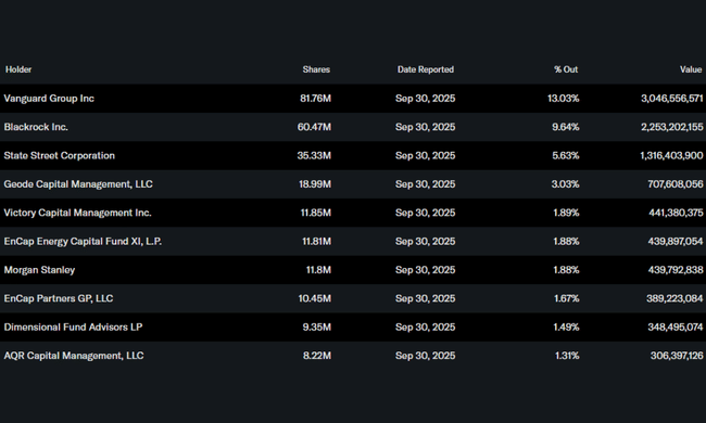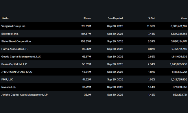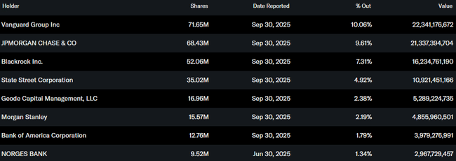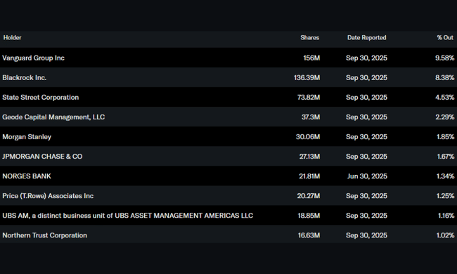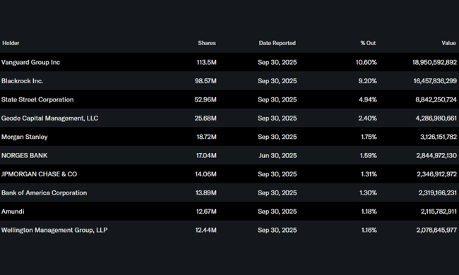 Major shareholders include Vanguard with roughly 9.6%, BlackRock with over 8% and State Street with over 4.5%. They are complemented by Geode Capital and other large asset managers.
