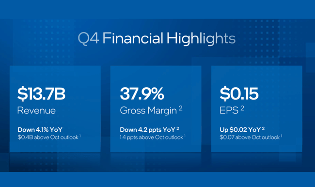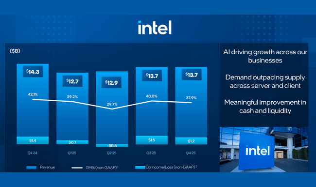 Intel $INTC ended 2025 with a quarter that looks like "stabilization after the storm" on a headline level, but beneath the surface you can see that the company is still teetering between restructuring, margin pressure, and transitioning to a new manufacturing and product cycle. In the fourth quarter, Intel posted revenue of $13.7 billion, down 4% year-over-year. But at the same time, management points out that internal expectations were better - according to CFO Zinsner, Intel beat its own expectations in revenue, gross margin and earnings per share, despite across-the-board outages and supply chain strains.