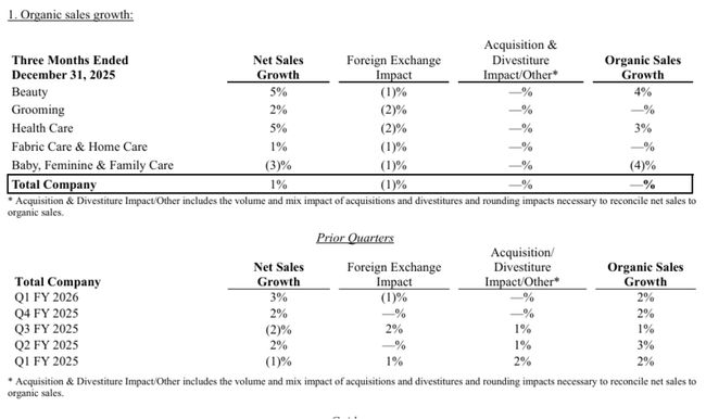 P&G $PG -reported sales of $22.2 billion in the second fiscal quarter of 2026, up 1% year-over-year. However, organic sales were flat - a 1% price increase was fully offset by a 1% decline in volumes, while product mix had a neutral impact. This is a key signal, as the company has for several years been primarily based on the pricing power of its brands rather than demand growth.