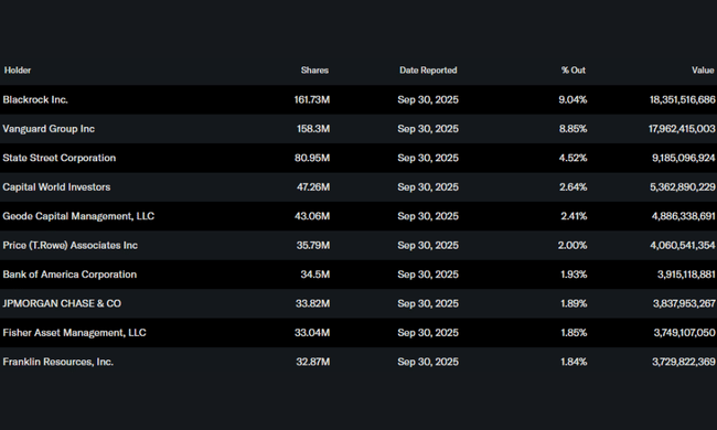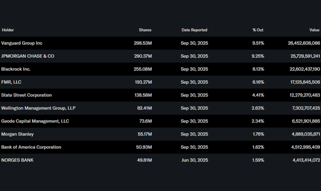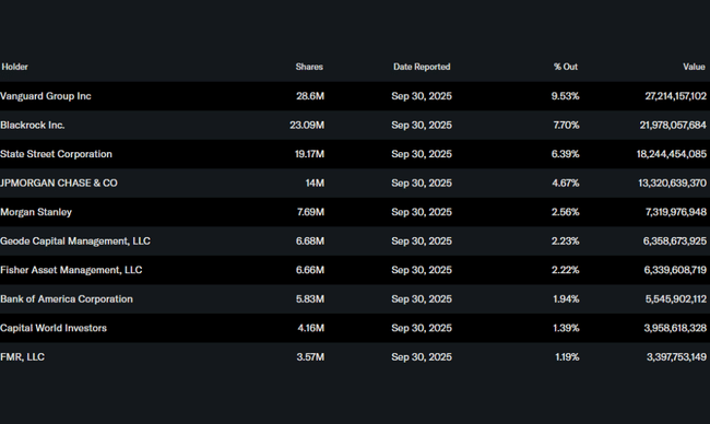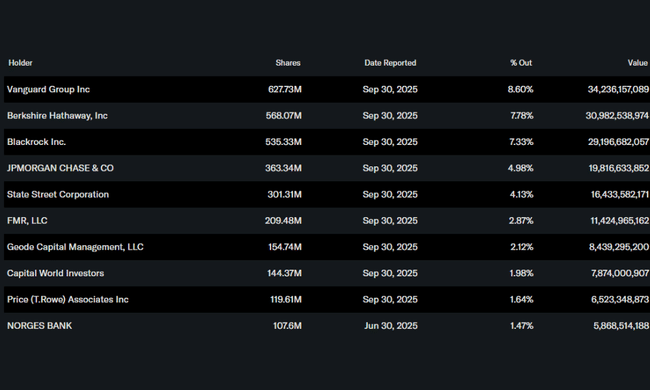 Wells Fargo's shareholder structure remains highly institutional. Approximately 79% of shares are held by institutional investors, while the share of insiders is negligible. The largest shareholder is Vanguard Group with 9.5%, followed by JPMorgan Chase with 9.3% and BlackRock with 8.1%. Fidelity also holds a significant stake through FMR. This structure confirms that the title is seen as a long-term position for large institutional investors rather than a speculative bet.