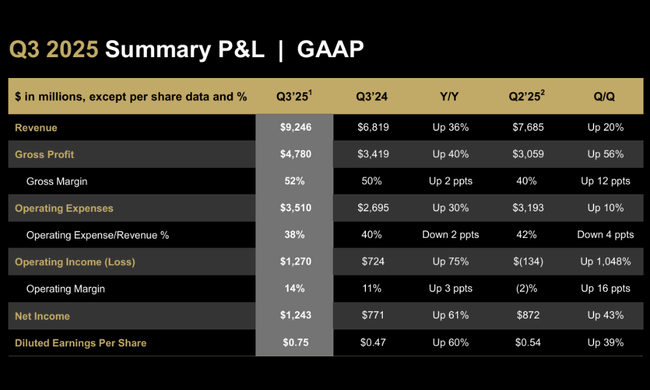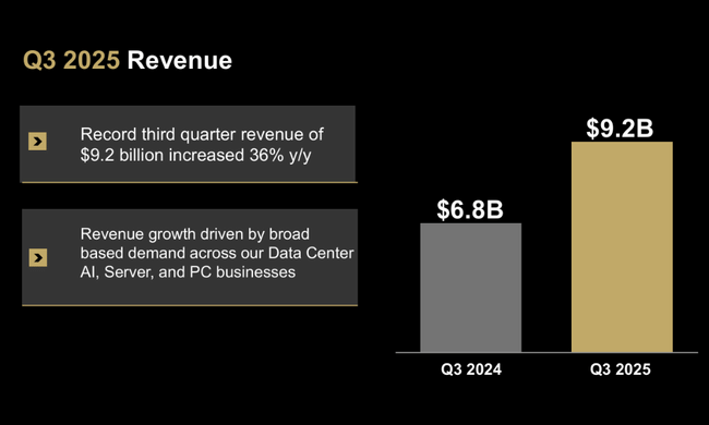 Q3 2025 was a recordquarter for $AMD in terms of both revenue and profitability. Revenues reached $9.25 billion, up 36% year-over-year and a solid sequential growth rate of 20%. Driven primarily by EPYC datacenter processors and Instinct AI accelerators, but also by the client and gaming business, which is returning to growth mode after a weaker period. Importantly, the company was also able to significantly improve margins - GAAP gross margin rose to 52%, while non-GAAP gross margin held at a very comfortable 54%.