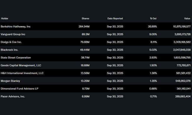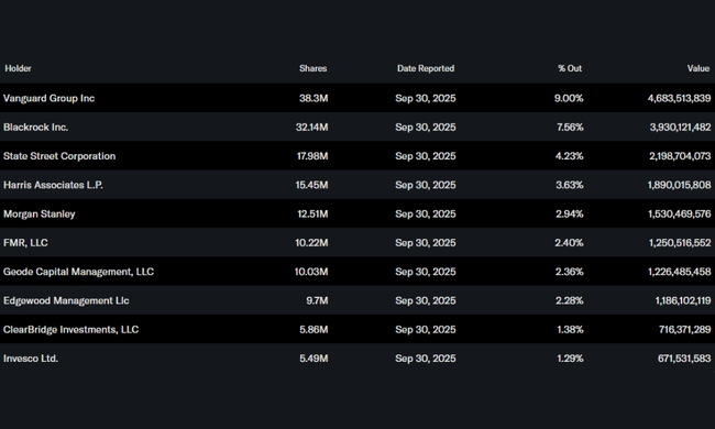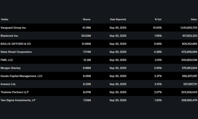 Institutional investors hold approximately 73.6% of the shares. The largest shareholders are: