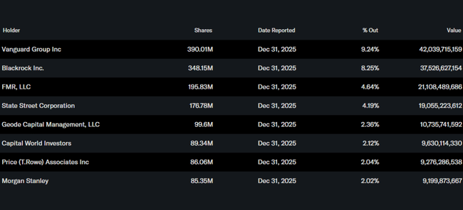 Netflix is now a classic big blue chip, with institutional ownership playing a major role. Management and other insiders hold less than one percent of the shares, while institutions own more than 80% of the total number of shares and free float. The largest shareholders are global asset managers such as Vanguard, BlackRock, Fidelity and State Street, each with a few percent stake. This means that short-term price swings are very sensitive to the mood of a few dozen large funds - when they decide to reduce exposure after earnings for a more conservative earnings outlook, the stock can react very quickly, even if the company's fundamental story doesn't change much.