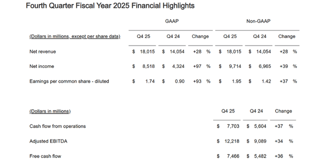 Profitability improved at an even stronger pace than revenue itself. GAAP net income reached $8.5 billion, nearly doubling from the same period last year. GAAP earnings per share rose 93% to $1.74, while non-GAAP EPS reached $1.95, up 37% year-over-year. Adjusted EBITDA was $12.2 billion, equivalent to an exceptionally high margin of approximately 68% of sales.