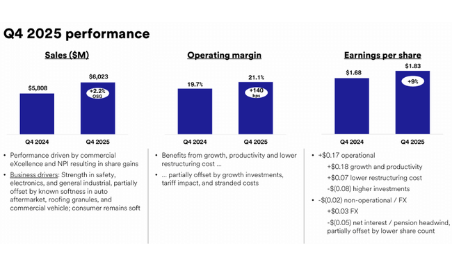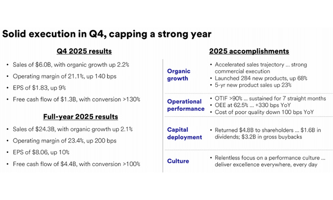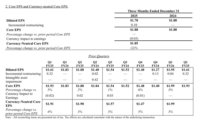 At the profitability level, cost pressures and restructuring were evident. GAAP EPS declined to $1.78, down 5% YoY, primarily due to higher restructuring costs. Core EPS was $1.88 and remained unchanged year-over-year, meaning that even after adjusting, the company failed to grow profitably. Currency-adjusted core EPS even fell 2% to $1.85.
