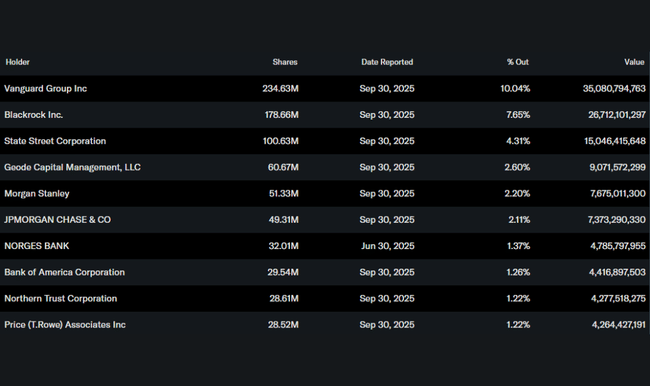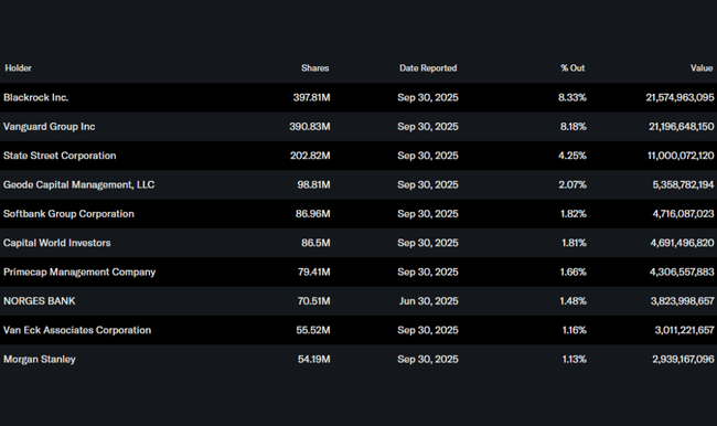 Intel remains the quintessential institutional title: around 63.7% of shares are held by institutions, with BlackRock and Vanguard being the largest shareholders, both around 8.2%-8.3%, followed by State Street (4.25%) and Geode. Insider ownership is low (1.89%), which is not unusual for a firm of this size, but it also means the investment story is based more on execution and market confidence than "skin in the game" leadership.