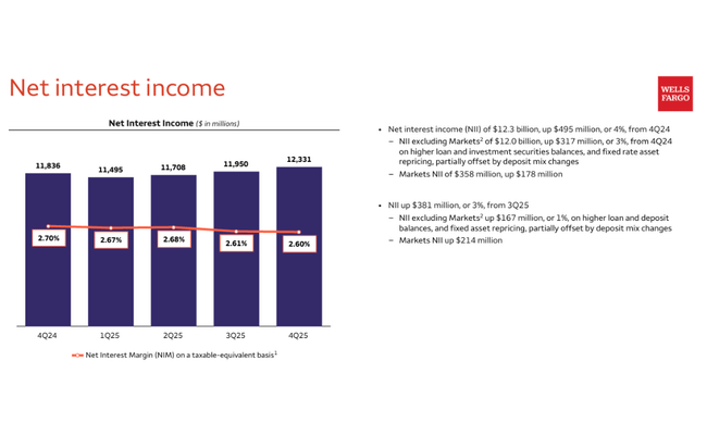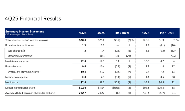 Wells Fargo $WFC reported net income of $5.4 billion for the fourth quarter of 2025, which equates to earnings per share of $1.62. This is a year-over-year improvement from $5.1 billion and $1.43 per share in Q4 2024. Adjusted for a one-time severance item of $612 million, earnings would have been $5.8 billion and $1.76 per share, respectively, confirming the bank's solid operating performance.