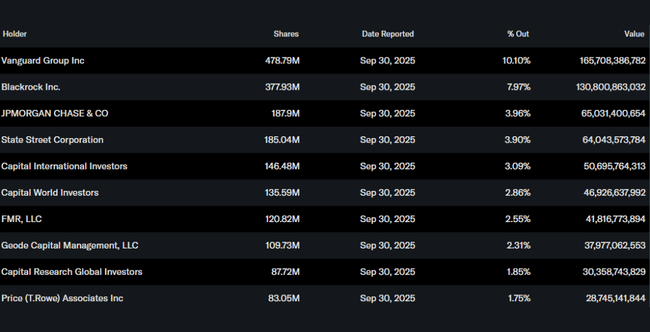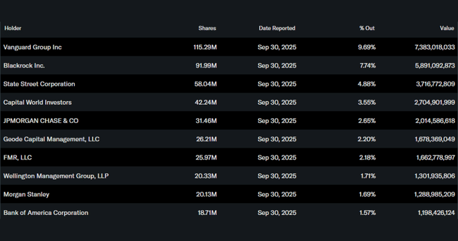 Broadcom has a strongly institutional shareholder structure. Approximately 79% of shares are held by institutions, with Vanguard Group, BlackRock, JPMorgan Chase and State Street being the largest shareholders. Insider ownership is low, which is typical for a firm of this size, and the shareholder base is predominantly comprised of long-term capital.