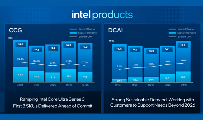 Segment-wise, the picture was significantly mixed and for investors this is one of the most important signals of the quarter. Client Computing Group (CCG), the traditional PC business, earned $8.2 billion, down 7% year-over-year, and $32.2 billion for the full year, down -3%. In contrast, Data Center and AI (DCAI) is growing: $4.7 billion in the quarter represents +9% YoY and the full year $16.9 billion represents +5%. This confirms that Intel may be losing momentum in the traditional PC segment, but datacenter demand and AI infrastructure are keeping the company afloat. In addition, Intel Foundry posted $4.5 billion in Q4 revenue (+4%) and $17.8 billion for the year (+3%), which is a positive signal for the "new Intel" strategy - just be reminded that Foundry revenue includes significant internal intersegment transactions that are subsequently eliminated, so the net impact on consolidated revenue should be read with caution.