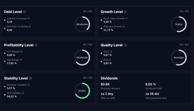 The data from Bulios support this picture. Revenues are growing very slowly or stagnating, while profitability is maintained mainly through cost control and high monetisation of existing customers. At the same time, debt levels are higher than those of the previous two companies, which is not an immediate problem in a stable rate environment, but increases the company's sensitivity to longer-term structural weakening of the business.