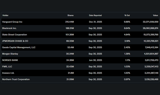 The shareholder structure remains strongly institutional, with institutions holding around 60% of the shares. The largest shareholders are Vanguard, BlackRock and State Street, followed by JPMorgan and several other large asset managers. Insider holdings exceed 3.5%, which for a technology firm of this size still represents a relatively significant alignment of management interests with shareholders.