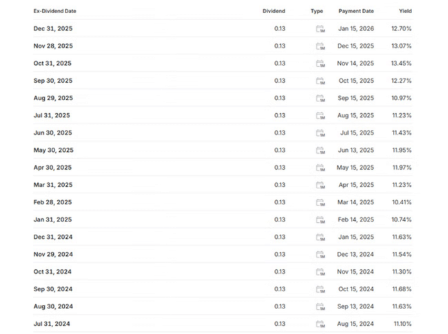 The dividend is the main reason investors are interested in Stellus Capital. The current payout is $0.13 per share per month, which at the current price equates to a yield of around 13% per year. The payout is monthly, which is a significant advantage over quarterly dividends for cash-flow oriented investors.