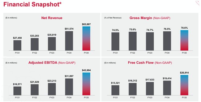 A long-term view of Broadcom's performance shows a company that has undergone a significant transformation towards a highly profitable technology business. Revenue grew from approximately $33.2 billion in fiscal 2022 to $63.9 billion in 2025. This growth has not been uniform, but has accelerated significantly in the last two years, largely due to expansion in AI and infrastructure software.