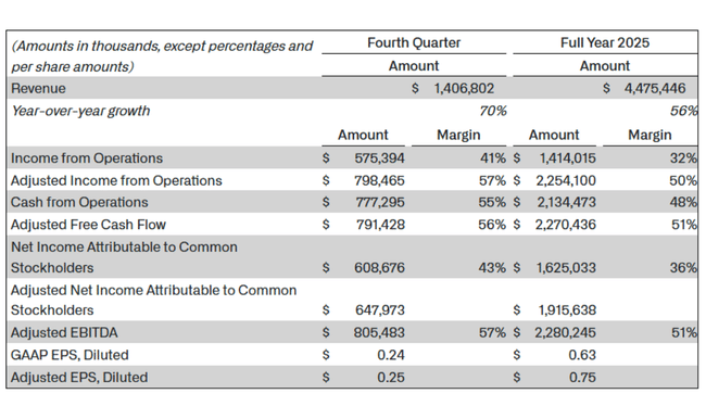 The cash flow confirms that this is not an accounting illusion. Operating cash flow in the quarter was $777 million, a 55% margin, and adjusted free cash flow was $791 million. The company ended the year with $7.2 billion in cash and short-term U.S. Treasury bonds, no funding pressure, and significant room for further expansion.