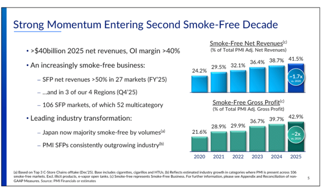 2025 was an exceptionally strong year in terms of product portfolio. PMI's smokeless products are now available in 106 countries and have over 43 million users. The IQOS brand maintains its dominant position in the heated tobacco category and continues to increase share in key European and Asian markets.