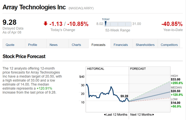 Les ventes de l'entreprise ont récemment affiché une croissance. Au quatrième trimestre de l'exercice 21, la société a déclaré un chiffre d'affaires de 219,9 millions de dollars, soit une augmentation de 22 % d'une année sur l'autre - et le deuxième meilleur résultat trimestriel en termes de chiffre d'affaires depuis que la société est entrée en bourse en octobre 2020. En ce qui concerne les bénéfices, Array a déclaré une perte nette au troisième et au quatrième trimestre - mais pour l'ensemble de l'exercice 2021, la société a affiché un bénéfice net par action de 7 cents. C'est toujours un bénéfice, mais il est faible par rapport aux 93 cents par action du rapport 2020 😥.