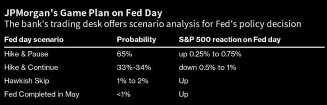 Comme on peut le voir, et ce n'est pas difficile à traduire pour les non-anglophones, l'hypothèse selon la société est une augmentation de 0,25 point aujourd'hui. Ce qui n'est pas une nouvelle pour ceux d'entre nous qui regardent cela, c'est plutôt dans les attentes, mais il sera assez intéressant de voir comment la Fed traitera les prochaines perspectives. Personnellement, je pense qu'il y aura également une pause après cela, avec la conférence disant à peu près des mots comme, "Nous allons regarder les chiffres, les résultats économiques, et ensuite nous verrons si c'est la dernière hausse ou si nous allons en avoir une autre avant la fin de l'année". Si ce scénario se produit, comme même les analystes penchent pour 65 %, il est probable que nous verrons d'autres jours verts à l'avenir grâce aux résultats des grandes entreprises. 🍀