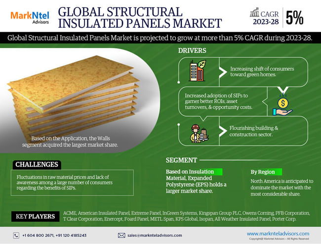 The Global Structural Insulated Panels Market size is projected to grow at a CAGR of around 5% during the forecast period 2023-28. MarkNtel Advisors recently released a research report on the market, offering an inclusive & unbiased analysis of the industry dynamics. It highlights current market trends & consumer behavior and explores the cause-and-effect relationships between these trends.
