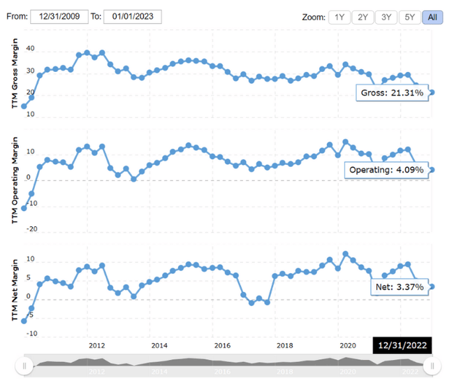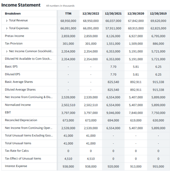 Looking at the company's profit and loss statement for the last twelve months (TTM), the company had total revenue of $68.95 billion. This represents an increase from last year's sales of $66.04 billion. However, total expenses also increased from $57.91 billion to $66.09 billion in the same period, resulting in lower pre-tax income of $2.86 billion compared to $8.13 billion in the previous year.