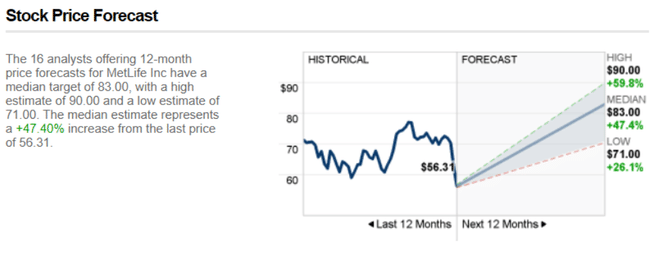 The 16 analysts offering 12-month price forecasts for MetLife have a median target of 83.00, with a high estimate of 90.00 and a low estimate of 71.00. The median estimate represents a +47.40% increase from the last price of 56.31.