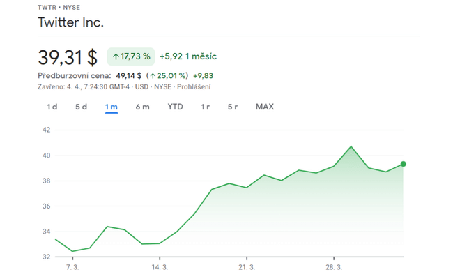 Lundi à 7h00 EDT, les actions de Twitter $TWTR étaient en hausse de 25% à 49,30$ dans les échanges de pré-marché.