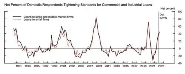 According to a Federal Reserve survey of senior loan officers, nearly 45% of banks made it more difficult for businesses to obtain commercial and industrial loans in the fourth quarter of 2022. The $2.8 trillion C&I loan market helps businesses buy equipment and hire employees. Measures taken by banks included raising minimum credit scores and minimum payments and reducing loan limits. Moreover, this tightening occurred even before the "explosion" of Silicon Valley Bank and Signature Bank.