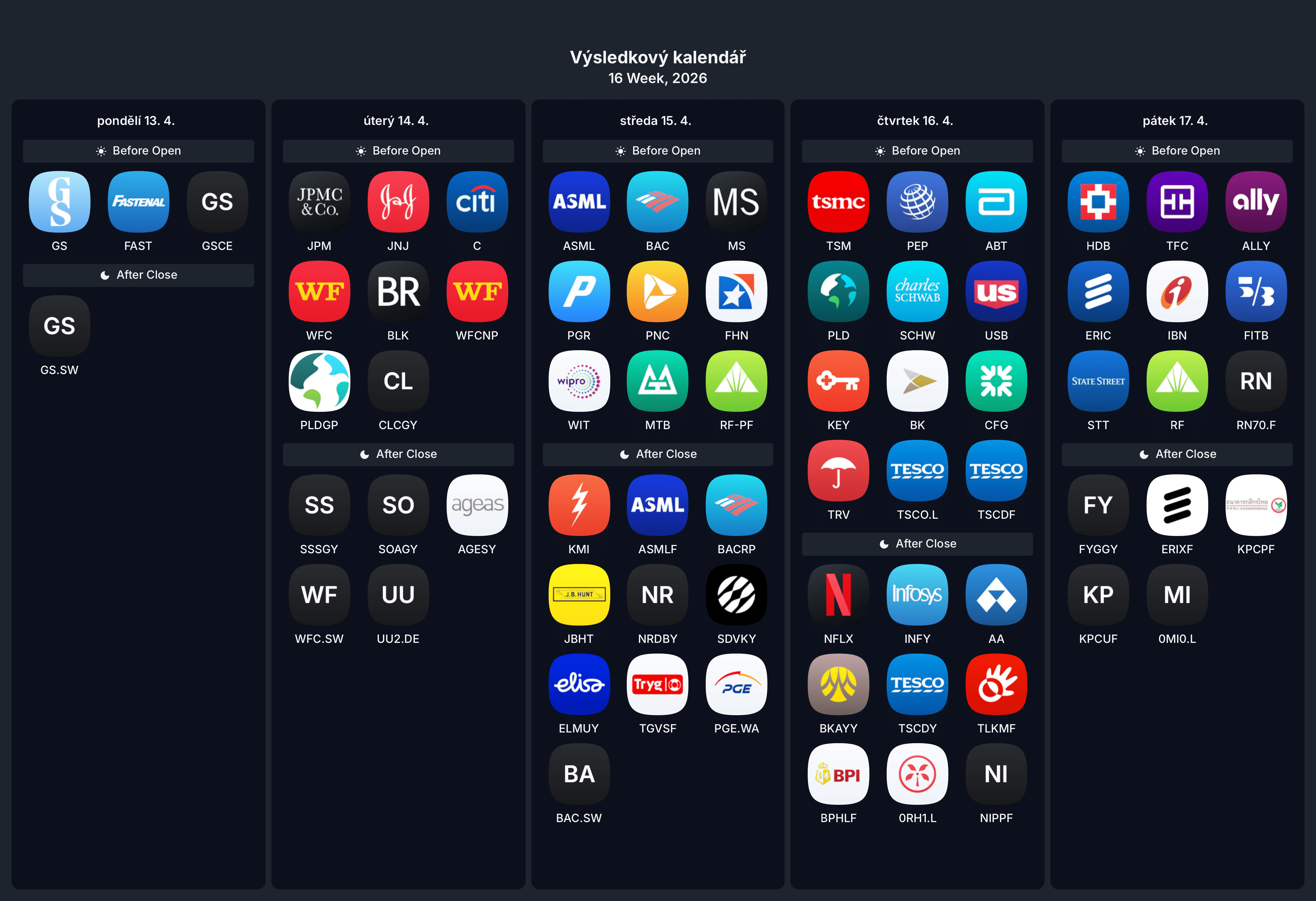 Příští týden začíná výsledková sezóna, což znamená, že se pravděpodobně dočkáme zajímavých příležitostí. V první polovině týdne budou reportovat výsledky velké banky jako $C, $BAC, $MS, $JPM nebo $WFC. Následně přijdou na řadu i technologické společnosti $ASML, $TSM a $NFLX.