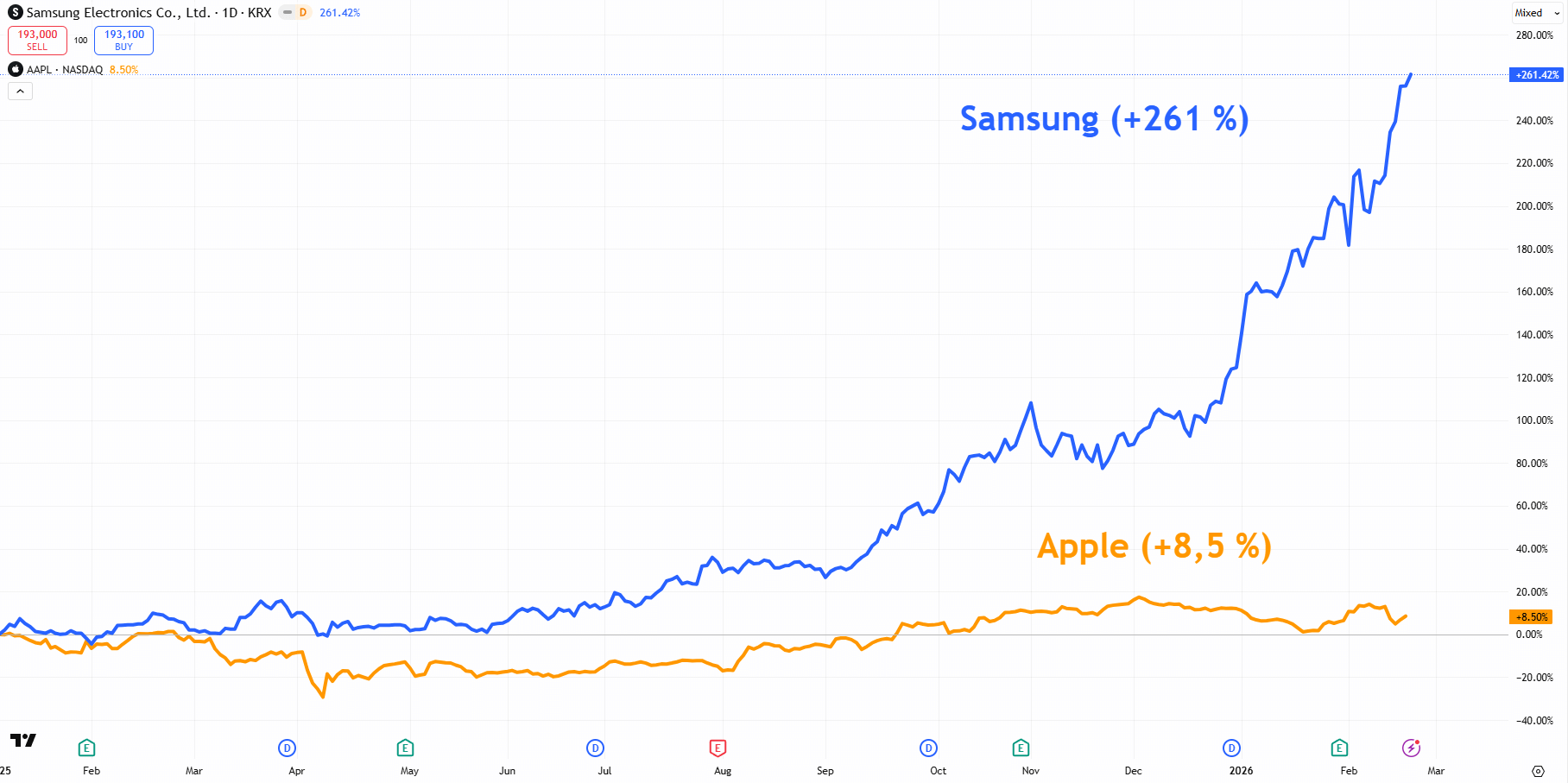 Souboj je při pohledu na graf dost nevyvážený. Akcie $AAPL posilují o 8,5 % zatímco Samsung přidal už 261 %! Co se děje za oponou?